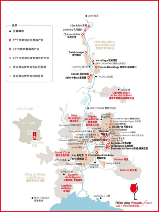 發(fā)源于阿爾卑斯山(Alps)的羅納河(Rhone River)是法國的主要河流之一,它綿延800余公里,最終向南流入地中海,也滋養(yǎng)了法國最重要的葡萄酒產區(qū)之一——羅納河谷葡萄園(Rhone Valley Vineyards),是這里名副其實的“母親河”。