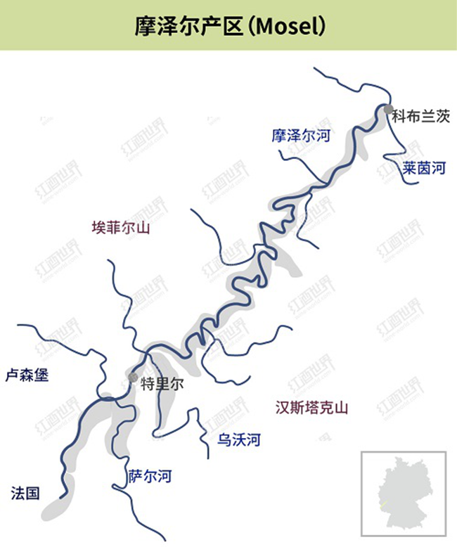 摩澤爾(Mosel)是德國13個法定葡萄酒產區之一,產區內種植的釀酒葡萄品種主要有雷司令(Riesling)、米勒-圖高(Muller-Thurgau)和艾伯靈(Elbling),其中最有代表性的品種非雷司令莫屬。如今,摩澤爾已經成為當今世界上最大的雷司令產區之一,出產的雷司令品質卓越,享譽全球。
