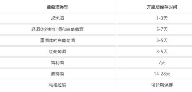不同類(lèi)型的葡萄酒,其開(kāi)瓶后能夠保存的時(shí)間也不一樣。具體如下: