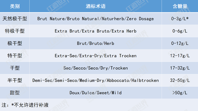 以上的分類方法主要適用于靜止葡萄酒,而起泡酒的含糖量分類與靜止葡萄酒不同,也更為細(xì)化,具體可參照下表。