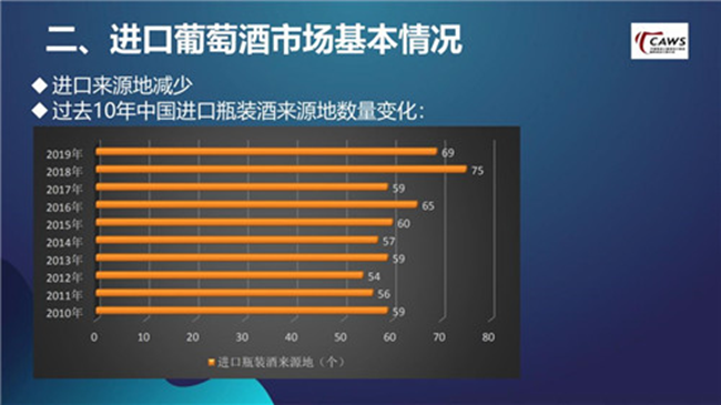 此外,進口來源地減少,2019年瓶裝酒進口來源地前十位約占進口總額的96.0%。其中,又以澳大利亞葡萄酒的表現最為突出,在2019年以8個點的差距反超了法國葡萄酒,但在接下來的市場競爭中,澳大利亞葡萄酒也面臨一定挑戰:首先,零關稅、大品牌驅動、投資移民等因素的推動作用會在階段性變化中逐漸減弱,澳洲與法國在接下來的市場中差距不會進一步拉大;其次,意大利、智利等國葡萄酒在中國市場競爭愈加激烈化,近兩三年來,他們明顯加強了在中國市場的投入,處在一個比較穩定的上升階段,我個人比較看好他們接下來的表現。
