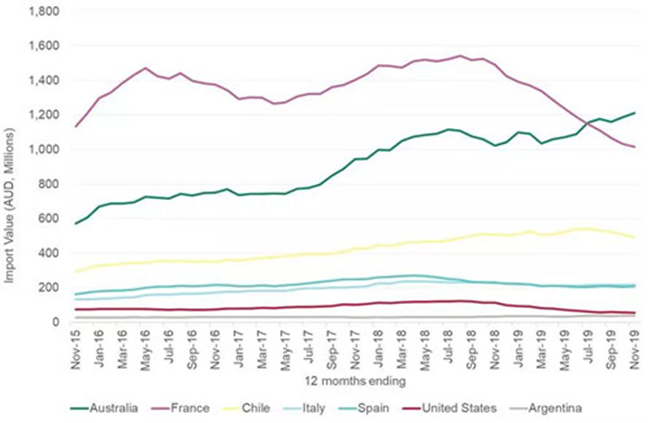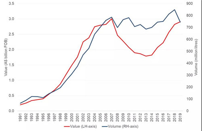 截至2019年12月底的12個月中,澳大利亞葡萄酒對中國市場(包括香港和澳門)的出口額增長12%,創(chuàng)下12.8億澳元新高,出口量下滑17%至1.42億升 (等量于1580萬箱9升裝)。平均出口額增長35%至8.99澳元(每升離岸價)。澳大利亞葡萄酒對中國市場的出口總額及平均出口額雙雙創(chuàng)下了年度新高。