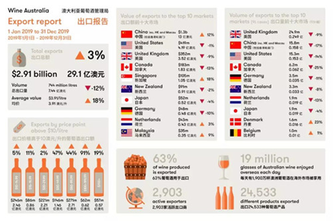 近日,澳大利亞葡萄酒管理局公布了最新出口報告。截至2019年12月底的12個月,澳大利亞葡萄酒對中國市場的出口總額及平均出口額雙雙創(chuàng)下年度新高。