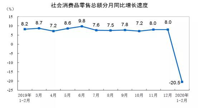 國內自1月份開始受到疫情沖擊,生產消費幾乎冰凍。1-2月份,社會消費品零售總額52130億元,同比名義下降20.5%(扣除價格因素實際下降23.7%,以下除特殊說明外均為名義增長),較去年12月大幅下滑28.5和28.2個百分點,其中僅糧油食品、飲料、藥品等少數(shù)維持正增長。(數(shù)據(jù)來源:國家統(tǒng)計局)