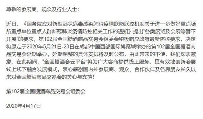關(guān)于第102屆全國糖酒商品交易會延期舉辦的通知