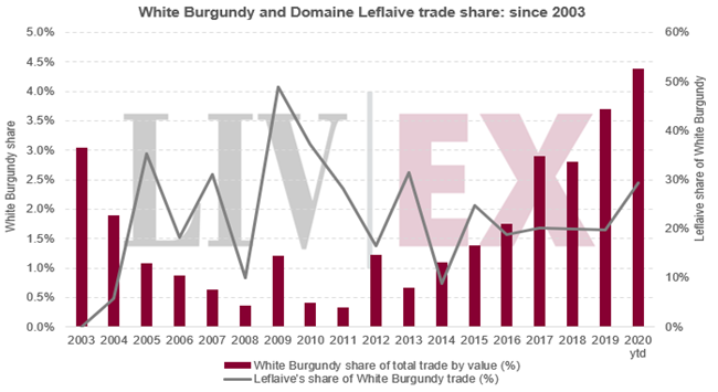 在二手市場(chǎng)上,勒弗萊Leflaive葡萄酒占了勃艮第白葡萄酒很大部分的交易。 2009年,雖然勃艮第白葡萄酒僅占總交易1.2%,但當(dāng)中勒弗萊卻占了一半以上。 本年至今,勃艮第白葡萄酒占總交易已增至4.3%;當(dāng)中勒弗萊也占近三分之一。