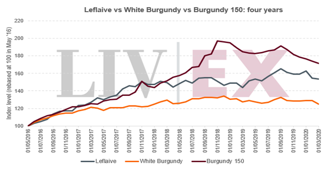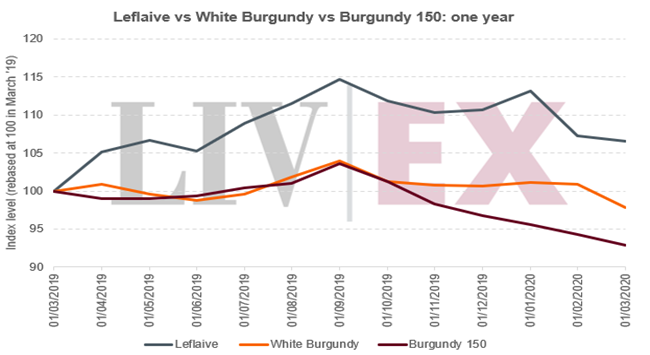 然而,在過(guò)去的一年,勒弗萊(6.5%)的表現(xiàn)也優(yōu)于勃艮第150(-7.2%)。 事實(shí)上,勃艮第150指數(shù)是表現(xiàn)最差的Liv-ex 1000分項(xiàng)指數(shù); 我們?cè)谧罱膶?zhuān)題報(bào)告: 高峰后的勃艮第 中也探討了它的跌勢(shì)。