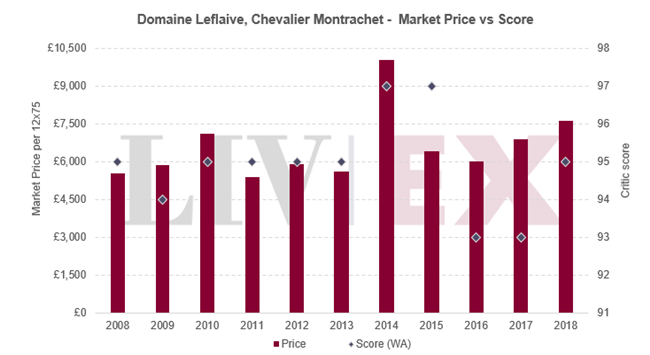 最后,下圖比較了勒弗萊的Chevalier Montrachet(該品牌交易最活躍的葡萄酒)最近十個(gè)年份的市場(chǎng)價(jià)格。 它最新的2018年份自去年12月在英國(guó)發(fā)布以來(lái),市場(chǎng)價(jià)格已漲了19%。