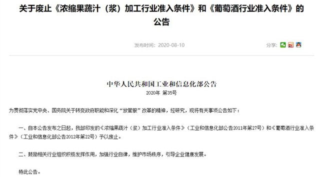 8月10日,中華人民共和國工業(yè)和信息化部發(fā)布公告,稱即日起廢除《濃縮果蔬汁(漿)加工行業(yè)準(zhǔn)入條件》(工業(yè)和信息化部公告2011年第27號(hào))和《葡萄酒行業(yè)準(zhǔn)入條件》(工業(yè)和信息化部公告2012年第22號(hào))。此外,鼓勵(lì)相關(guān)行業(yè)組織積極發(fā)揮作用,加強(qiáng)行業(yè)自律,維護(hù)市場(chǎng)秩序,引導(dǎo)企業(yè)健康發(fā)展。
