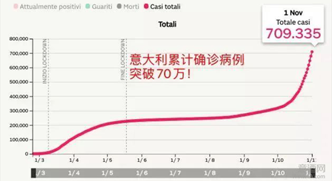 據(jù)意大利衛(wèi)生部11月1日公布的最新統(tǒng)計(jì)數(shù)據(jù),過去24小時(shí)意大利全國新增新冠病毒感染病例29907例,累計(jì)感染709335例;新增死亡208例,累計(jì)死亡38826例;累計(jì)治愈292380例,其中新治愈2954例。