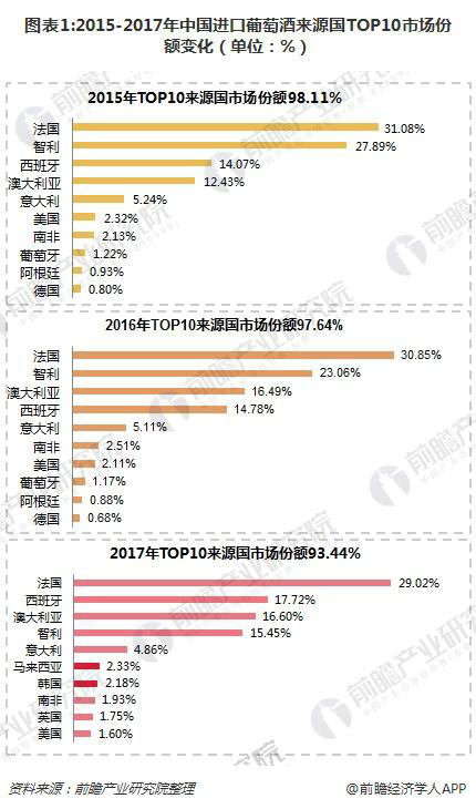 根據(jù)2017中國進(jìn)口葡萄酒貿(mào)易數(shù)據(jù),TOP10來源國市場份額從2015年的98.11%降至2017年的93.45%,進(jìn)口來源國繼續(xù)邁向多元化。法國占比繼續(xù)下降,澳大利亞、西班牙延續(xù)上升勢頭,葡萄牙、阿根廷前十地位被擠占。值得注意的是,新晉前十的馬來西亞、韓國、英國葡萄酒進(jìn)口量從無到有,直接碾壓葡萄牙、阿根廷,躍居第六、七大來源國。