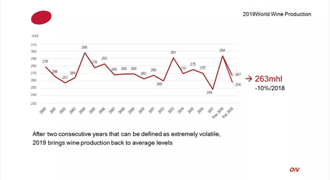 據(jù)國際葡萄與葡萄酒組織(OIV)最新數(shù)據(jù)顯示,2019年全球葡萄酒產(chǎn)量為263億升(mhl),同比2018年下降了10.54%。包括法國、意大利、西班牙在內(nèi)的葡萄酒主產(chǎn)國產(chǎn)量均有不同程度下降。OIV的數(shù)據(jù)來自28個國家,占全球葡萄酒產(chǎn)量的85%。