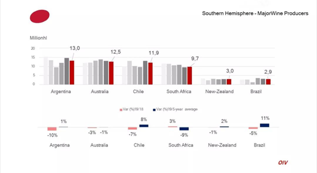 南半球葡萄酒產(chǎn)國中,阿根廷產(chǎn)量跌幅最重,下降10%,南非則逆勢增長3%。