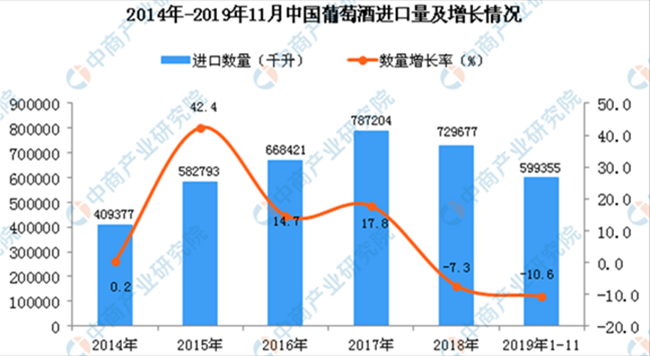 據(jù)中商產(chǎn)業(yè)研究院數(shù)據(jù)庫(kù)顯示,2014-2017年中國(guó)葡萄酒進(jìn)口量逐漸增長(zhǎng),2018年中國(guó)葡萄酒進(jìn)口量有所下降;2019年1-11月中國(guó)葡萄酒進(jìn)口量為599355千升,同比下降10.6%。